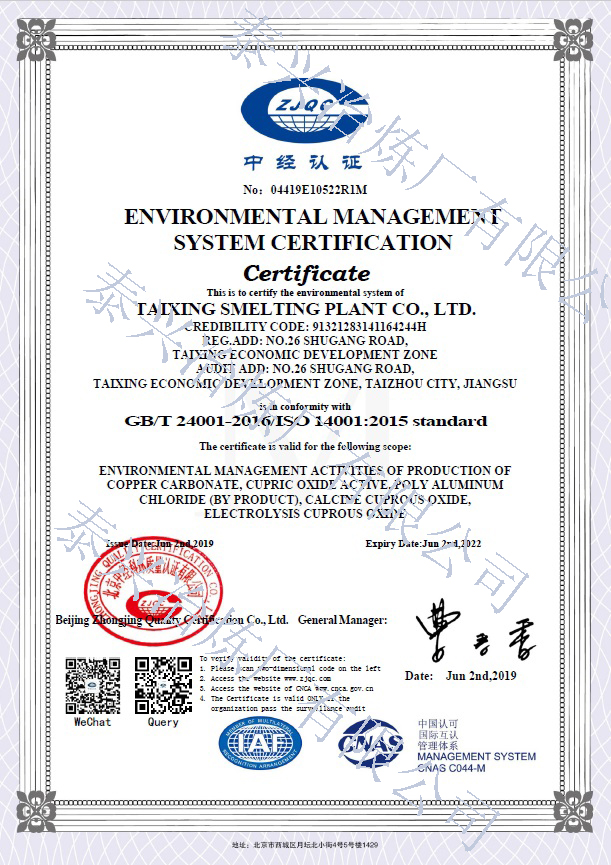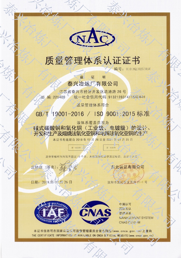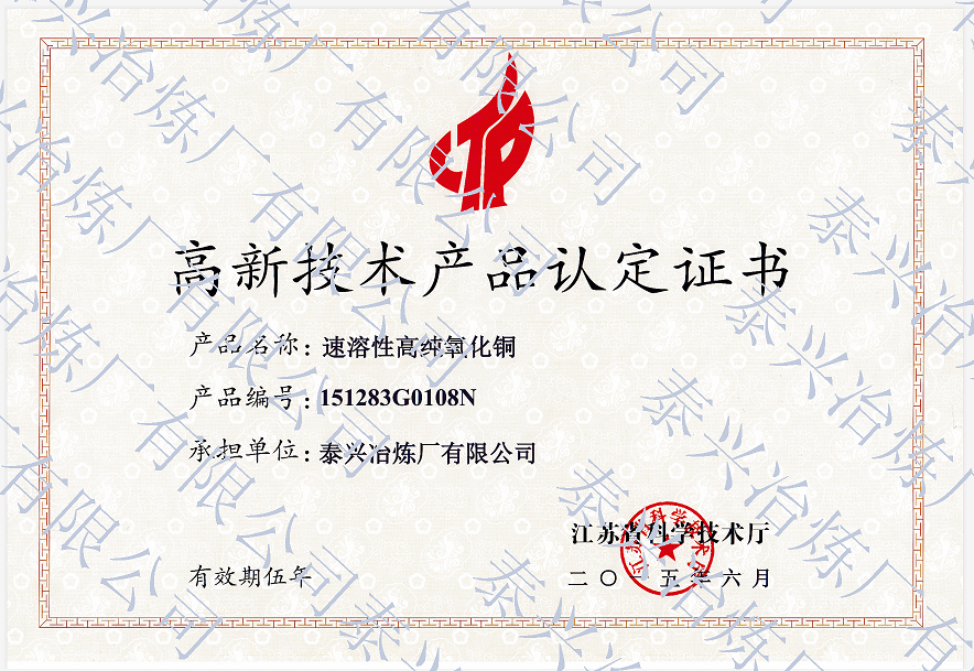 泰興冶煉廠有限公司(原泰興冶煉廠),始建于20世紀(jì)70年代初,現(xiàn)位于江蘇省泰興經(jīng)濟(jì)開發(fā)區(qū)。歷經(jīng)40年的創(chuàng)新驅(qū)動(dòng)、穩(wěn)健發(fā)展,已成長(zhǎng)為一家專業(yè)生產(chǎn)堿式碳酸銅、高純電鍍氧化銅、氧化亞銅、氧化銅、無(wú)水硫酸銅、海綿銅粉及副產(chǎn)品聚氯化鋁(凈水劑)等系列無(wú)機(jī)鹽產(chǎn)品及處置不含氨的氯化銅蝕刻液(HW22)15000噸/年的“國(guó)家高新技術(shù)企業(yè)”和地方性骨干企業(yè)。公司總占地面積3.7萬(wàn)平方米,建筑面積4萬(wàn)平方米,注冊(cè)資本2088萬(wàn)元,固定資產(chǎn)1.2億元,年產(chǎn)值約7億元。